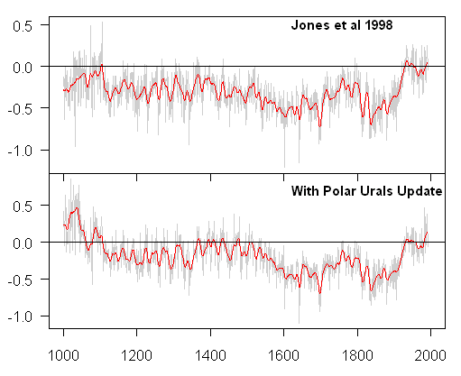 With the Polar Urals update, the 20th century Jones et al 1998 index is no longer higher in the 20th century than the MWP. This is from merely replacing one series with an update used in a later multiproxy study.