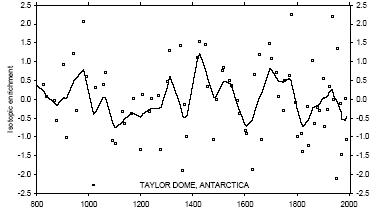As I think I indicated to you and most certainly to others who have this preliminary Law Dome isotope series, the direct interpretation of isotope fractionation as temperature proxy should be made with caution. Ice cores only record when snow is falling. Such periods occur in a stochastic fashion, with event sizes and intervals that result in a unique form of environmental record. Averaging very quickly recovers a signal that correlates well with temperature, although the properties of coastal sites with marine cyclonic precipitation differ from those far inland. Not surprisingly, the isotope fraction also responds to other climatic variables – the temperature response is but one manifestation.