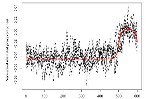 McIntyre and McKitrick (2003) demonstrated that under some conditions, the leading principal component can exhibit a spurious trendlike appearance, which could then lead to a spurious trend in the proxy-based reconstruction. To see how this can happen, suppose that instead of proxy climate data, one simply used a random sample of autocorrelated time series that did not contain a coherent signal. If these simulated proxies are standardized as anomalies with respect to a calibration period and used to form principal components, the first component tends to exhibit a trend, even though the proxies themselves have no common trend. Essentially, the first component tends to capture those proxies that, by chance, show different values between the calibration period and the remainder of the data. If this component is used by itself or in conjunction with a small number of unaffected components to perform reconstruction, the resulting temperature reconstruction may exhibit a trend, even though the individual proxies do not. Figure 9-2 shows the result of a simple simulation along the lines of McIntyre and McKitrick (2003) (the computer code appears in Appendix B). In each simulation, 50 autocorrelated time series of length 600 were constructed, with no coherent signal. Each was centered at the mean of its last 100 values, and the first principal component was found. The figure shows the first components from five such simulations overlaid. Principal components have an arbitrary sign, which was chosen here to make the last 100 values higher on average than the remainder.(86-87)