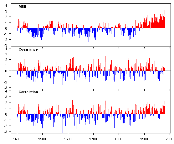 Using two PCs from this network as in MBH98, these different results have a substantial impact on an MBH98-type reconstruction (although again their regression methodology is itself not neccessarily "right" a priori.) This is simply an empirical result. In our 2005 E&E article, we summarized a variety of results, including that the reconstruction using correlation PCs was intermediate between reconstructions using covariance PCs and Mannian PCs.