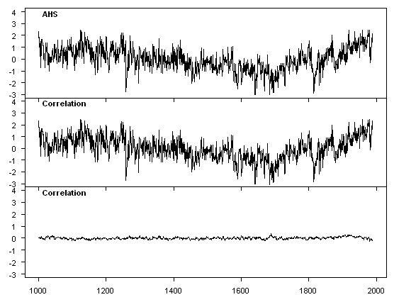 VZ carried out PC analysis on three different "regions", two of which are illustrated below. The figures below show the PC1 using Eduardo’s implementation of the Mannian method (AHS) and the correlation PC1 (the covariance PC1 is nearly identical), as well as the difference. Note that Region 1 had more proxies (55 to 9) and the difference between results is less, although it is tiny in both cases.For pseudoproxies constructed from gridcell temperatures with 50% white noise, the PC1 from the AHS calculation is virtually identical to the PC1 from the normal calculation.