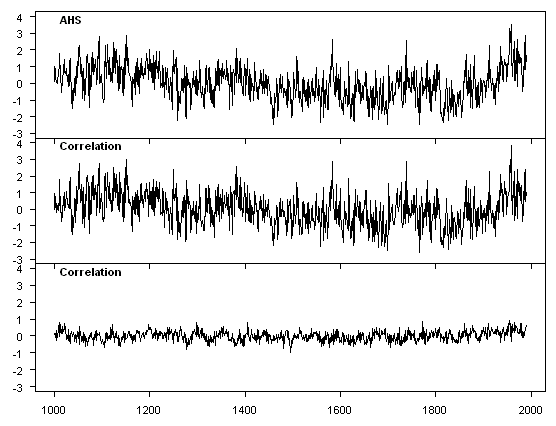 As shown below, I’ve determined that the the AHS has no effect on Eduardo’s results, not because of the climate model, but because the PC series are essentially identical when pseudoproxies are constructed with white noise under both Mannian and conventional PCs (either correlation or covariance). I would submit that the implication of this is: if a network consists of a signal plus white noise, then the PC1 is similar under different methods. This defines a test for whether the network consists of a signal plus white noise, and does not prove that the differing methods have no impact on a Mannian network.