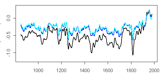 NH Temperature – Black – NH average; blue – MBH; cyan – MBH detrended.