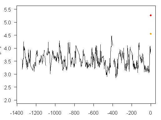 So how do you splice this series of Mg/Ca values to modern instrumental temperatures. You have to estimate how much they should be moved up and how much the series should be dilated by estimating how much Mg/Ca has dissolved. How did Hansen deal with this? In effect, he simply slid the the graph so that the last point on the graph (dated to 4320 BP) lined up the red dot.