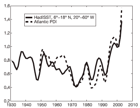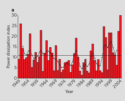 Emanuel 2005 Figure 1. A measure of the total power dissipated annually by tropical cyclones in the North Atlantic (the power dissipation index, PDI) compared to September sea surface temperature (SST). The PDI has been multiplied by 2.1 * 10^-12 and the SST, obtained from the Hadley Centre Sea Ice and SST data set (HadISST)22, is averaged over a box bounded in latitude by 6N and 18 N, and in longitude by 20W and 60W. Both quantities have been smoothed twice using equation (3), and a constant offset has been added to the temperature data for ease of comparison. Note that total Atlantic hurricane power dissipation has more than doubled in the past 30 yr.