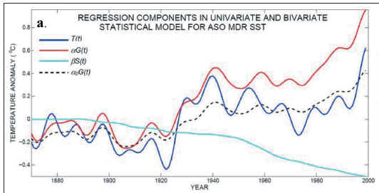 To represent potential enhancement of ASO tropospheric aerosol cooling over the MDR, the estimated Northern Hemisphere anthropogenic tropospheric aerosol forcing series available through 1999 [Crowley, 2000] was included as an additional predictor S(t):