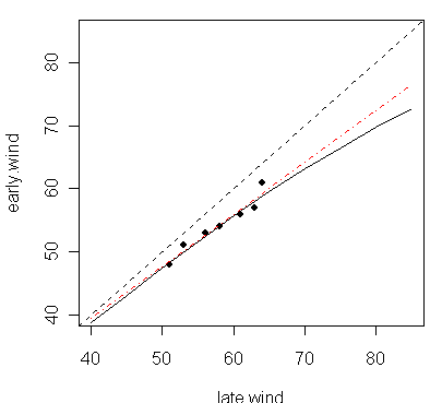 I’ve plotted the information from this table is plotted below with the earlier measurement method (vertical) and later measurement method (horizontal). To these 7 points, Emanuel 2000 fitted a slightly convex curve through the formula . The dashed red line shows a simple linear fit. The dashed black line shows the 45 degree line. If one takes Emanuel’s most recent comments at face value, this graph could equally stand for an increase in estimates for the period 1970-1990 rather than a reduction for the pre-1970 period. In his Comment on Emanuel, Landsea observed that this adjustment reached as high as 12 m sec-1 at higher speeds – a result not contemplated in the original article.
