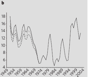 For me, it’s like one of those face-or-goblet illusions: looked at one way, I can see a trend, while looked at another way, I see a step-up circa 1990 followed by a flatlining.