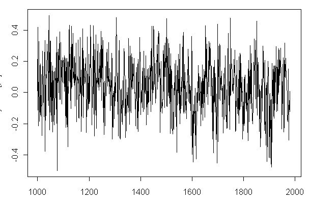 Juckes has archived 64 reconstruction variations in the file mitrie_new_reconstructions_v01.csv (mirrored in mitrie_new_reconstructions_v01.nc). The 9th platter in the jukebox is mr_mbh_1000_cvm_nht_01.02.001_pc – which is some kind of composite-variance-match version of MBH (whle he has 1 CVM version each for Esper, Hegerl, Jones and Moberg, he has no fewer than 7 different versions for MBH and I’m having difficulty sorting out which is which. However, the plot of the 9th platter is inriguing as shown below: