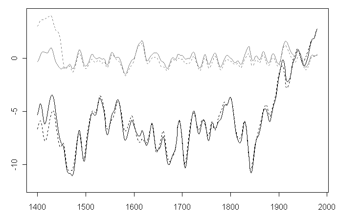 The sign of the Principal Component is arbitrary, I only mentioned it because you appear to attach importance to the direction of the perturbation.As regards the difference between your centred PC and the Mann et al. PC, would you agree that this is partly due to the fact that you have not normalised the data, so that proxy series with high variance contribute disproportionately to your PC? If the data is normalised (by setting cor=TRUE in the call to princomp) the leading PC does reflect the anomalous growth in the 20th century, though it is still significantly different from the Mann et al. PC. Wouldn’t you agree that using normalised data is appropriate here?