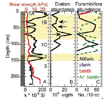 Brachfeld Original Caption: Figure 2. Digital photograph of KC23 and downcore profiles. [KC23 is furthest offshore.] A: Magnetic susceptibility and shear strength. B:Millions of diatom valves per gram of dry sediment. Arrows denote Corethron ooze layers. C: Foraminifera per20 cm3 sediment. Miliammina spp. (Milam.) and arenaceous benthics (Ar. benth) dominate KC23 profile. Calcareous benthics (benth) and planktics (plank) are restricted to Unit 1a.