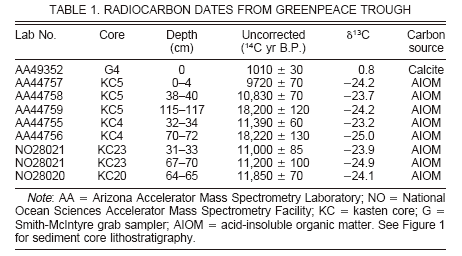 Antarctic marine carbonates have an ocean reservoir age of ca. 1200–1300 14C yr B.P. (Gordon and Harkness, 1992; Harden et al., 1992; Berkman and Forman, 1996). However, much of the sediment accumulating on the Antarctic shelf lacks calcareous organisms, necessitating the use of acid-insoluble organic matter (AIOM) from bulk sediment. The AIOM may be affected by reworked carbon from detrital humic macerals, kerogen from sedimentary rocks, and resuspended marine organic matter (Andrews et al., 1999; Domack et al.,1999).Microscope observations indicate that LIS-A organic carbon is a mixture of 25% carbon formed and deposited contemporaneously with the sediment and ~75% reworked organic carbon characterized by preaged terrestrial detritus. We obtained a radiocarbon age of 9720 +-65 14C yr from a sediment-water interface sample of AIOM and an age of 1010 +- 30 14C yr from a sample of living bryozoan calcite, which indicates the magnitude (~8700 yr) of the effect of reworked carbon on our radiocarbon ages (Fig. 1; Table 1). However, the surface sediment contains a greater abundance of sterols (0.3–0.55 mg/g) than the downcore material (~0.15 mg/g), where reworked carbon has had a greater impact on the resultant ages. A regional AIOM correction factor of 9000–9400 yr is indicated by paired calcite and AIOM 14C ages from LIS-B, where biogenic calcite is much more abundant than in LIS-A (Domack et al., 2002). These observations illustrate the difficulty of relying solely on AIOM radiocarbon ages from organically lean sediment.