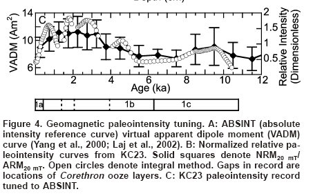 In an attempt to avoid reliance on potentially problematic radiocarbon dates, they wiggle-match geomagnetic intensity reversals in core KC23 against an intensity reference curve. Brachfeld et al: