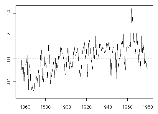 I had been meaning to ask Jukes whether Union and temperature cointegrated as a basic test that they hadn’t shown a spurious relationship. Looking at these residuals I think the answer is clear. The two series are not cointegrated because the residuals look to be strongly I(1). (Precisely, it looks like you can not reject H0 that the residuals are I(1) using an ADF or similar test). It is a basic point that you can make with reference to lots of econometric literature without worrying about the potential ambiguity of a DW statistic (although the DW statistic tells you essentially the same thing, the formal DF tests aren’t structured around the DW statistic).