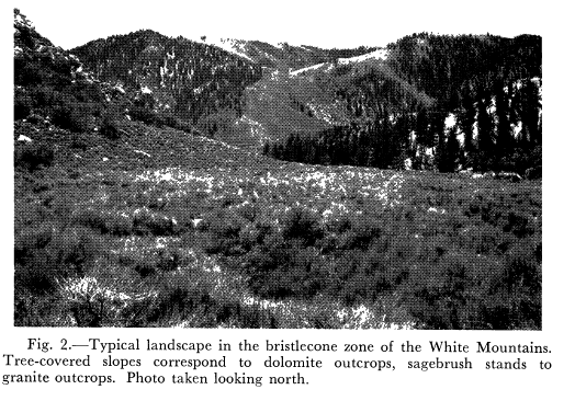#28. I wouldn’t place much weight on this particular recollection as the mapping of bristlecones on dolomites is firm (and the first mapping was done by geologists). Bristlecones also occur on sandstones, but the dolomite substrate is important and distinct.