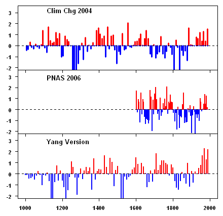 The Yang version also looks to me like it’s dated younger than the Climatic Change 2004 version. The downspike in about 1250 in the Climatic Change version looks like it occurs about 1450 in the Yang 2002 version. The 20th century values in the Yang version are at “anomalous” levels, but are not anomalous in the more recent PNAS version. What accounts for the difference?