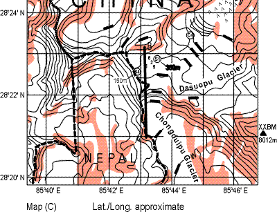 Here is an oversized image of the Guliya glacier from the wonderful Google Earth (there was a poster session showing applications at AGU so get used to seeing more and more of this. (I tried to reduce this in OpenOffice Draw but failed; I used to do this in an ancient Corel Draw, but it crashed my computer when I tried to load it). This image rather closely matches the map in Thompson et al 1996 (NATO, Climatic Variations), which has the most information on the site. The Summit (Site 4) is at 6700 m and the glacier is 103 m thick there (by radar). Site 2 and Site 1 are at 6200 m. The surface flow at Site 2 is 4.7 m/year to the SSE (towards Site 1). The glacier is 308.6 m thick at Site 2 and about 200 m at Site 1 – Site 2 is a topographic bottom. A diagram in Thompson et al 1996 shows radar cross-sections and shows that Site 2 is in somewhat of a valley going NW-SE towards Site 1. The Guliya site is to the W side of Tibet and is said to be affected by the Arabian Sea monsoon (not the SE Asian monsoon).
