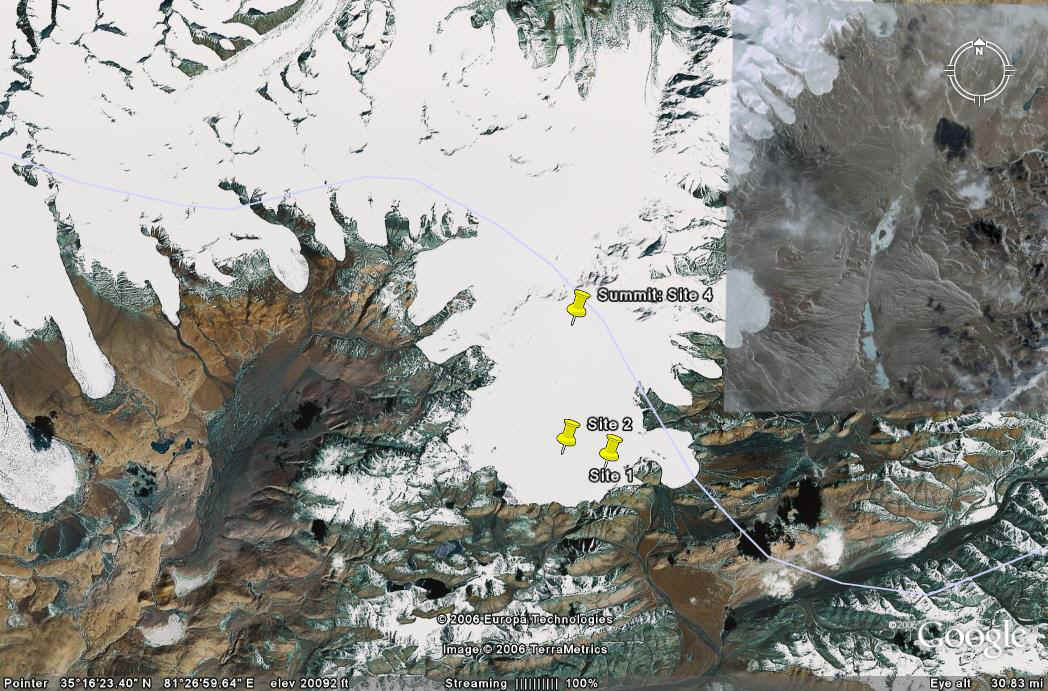 Figure 2. Google Earth image of Guliya glacier drill sites. 35 17N, 81 29E.