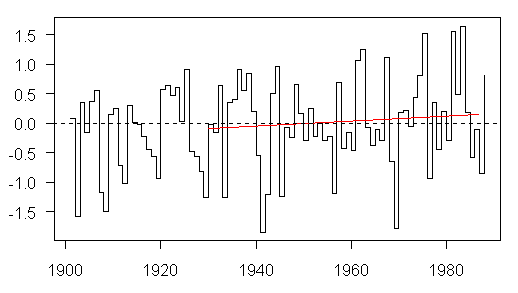 year<-1901:1988;fm<-lm(annual[year-1849]~year);coef(fm)[2]*87 #0.49