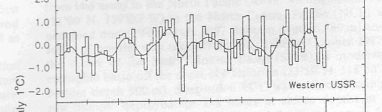 Figure 2. Top- clipped from Jones et al 1990 Figure 2a showing rural nework; bottom – calculated West Russian network annual average using HadCRUT3 gridcell.
