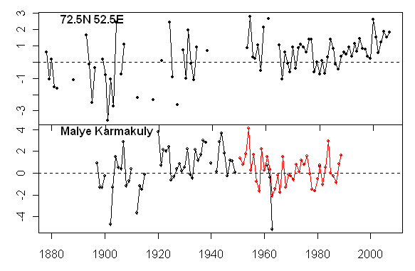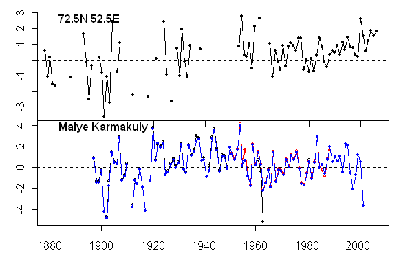 Obviously Jones is not using consistently the GHCNv2 version as archived. I’ve spent a fair bit of time scrounging through possible data locations and comparing different versions. Another Malye Karmakuly version is archived in connection with an archive of 59 Arctic sites for Overland et al (J Clim 2003) with the Malye KArmakuly data up to 2002 here.