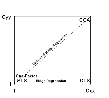 I’ve represented these methods in the following diagram that I find helpful. The three corners of my diagram are simply a visual representation of lines 2,3 and 4 of Borga’s Table 1, with Ridge Regression being the path along the “X” axis of the mixing coefficient and Canonical Ridge Regression following the line from PLS to CCA.