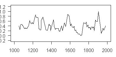 Here is a plot of the Dulan juniper series from the smoothed version used in Crowley and Lowery 2000 (just so you get your eye in.) We do not consider here the question of whether this particular series is a plausible proxy for temperature (and, given the undoubted evidence that temperatures rose in the 20th century, as well as the nearby desert, one might at least raise an eyebrow as to whether this is a plausible temperature proxy).
