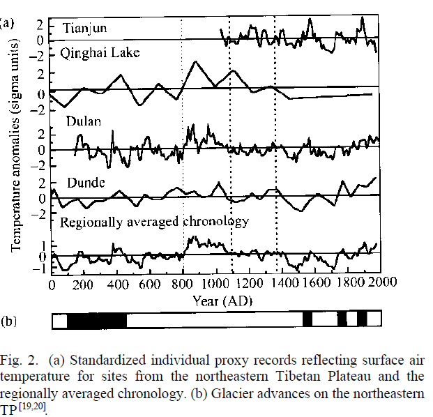 Figure 2. Caption to Gou et al 2006 Fig. 3. Temperature series and glacier advances in the northeastern TP. (a) Standardized decadal-scale proxy records reflecting surface air temperature for sites in the northeastern TP and 50 year means of regionally averaged temperature anomalies (after Yang, 2003): (1) tree-ring width chronology from Tianjun, Qilian Shan; (2) water temperature in Qinghai lake; (3) tree-ring widths from Dulan Qinghai; (4) d18O of Dunde ice core; (5) regionally averaged temperature. (b) Glacier advances (black bars) in northeastern Tibet (after Zheng and others, 1990; Wang, 1991). (c) Tree-ring width index reconstructed from the Animaqin mountains, which is negatively correlated with summer maximum temperatures. The y axis of the tree-ring width index has been reversed.
