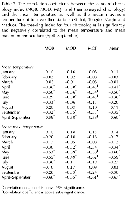 It is ture for this correlation between spring precipitation with ring widths. But it is also clear that temperature (especially prior autumn and winter temperature) has effect on the radial growth of dulan ring widths because the annually frozen soil layer may exert influence by way of delaying or speeding the thawing time in the coming spring.
