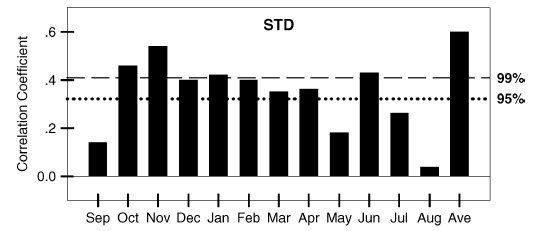 Original Caption: Figure 3. Correlation coefficients between the Standard (STD), Residual (RES) and Arstan (ARS) chronologies index and the observed minimum temperatures recorded at Xinhai meteorological station (1960—2001). Ave. in the Figure 3 means average minimum temperature of previous October to current April. The dashed lines indicate the 95% and the 99% significance levels.