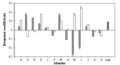 Original Caption: Figure 2. Response function coefficients showing the relationships between radial growth of Sabina przewalskii Kom. and monthly mean air temperature and total monthly precipitation for the regional climatic data set for the period 1953—2000. Lag 1 represents the tree-ring growth in the previous year. Black bars stand for temperature, white bars for precipitation, and x for significance at the 0.05 level as tested by bootstrap method.
