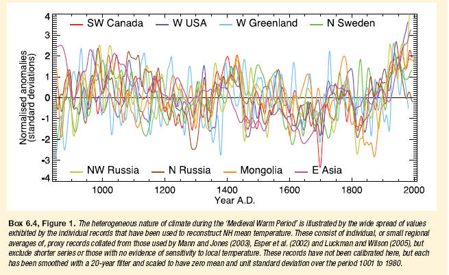 Box 6.4, Figure 1. The heterogeneous nature of climate during the Medieval Warm Period’ is illustrated by the wide spread of values exhibited by the individual records that have been used to reconstruct NH mean temperature. These consist of individual, or small regional averages of, proxy records collated from those used by Mann and Jones (2003), Esper et al. (2002) and Luckman and Wilson (2005), but exclude shorter series or those with no evidence of sensitivity to local temperature. These records have not been calibrated here, but each has been smoothed with a 20-year filter and scaled to have zero mean and unit standard deviation over the period 1001 to 1980.