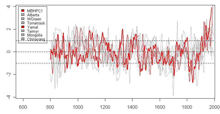To show the PC1 and Yamal series, I’ve re-plotted this with the Mann PC1 in thick red; Yamal in thin red and other series in light grey. You can see that the rhetorical effect of this diagram depends strongly on these two series. In addition to the discussion of the Mann PC1, Briffa’s substitution of the Yamal series for the Polar Urals update has been discussed before.