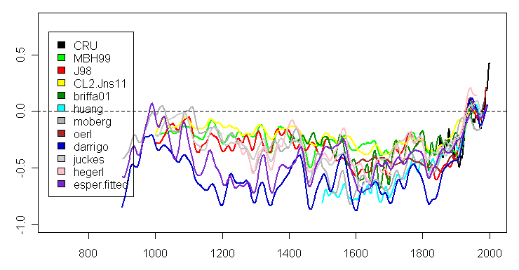 Most of the series already come using a 1961-90 reference period. Some are scaled against NH temperature north of 20N or 30N and some are scaled against NH temperature. This can cause a little difference in scales. The MBH99 series is archived in a 1902-1980 center. I am unable to locate any statement for Crowley 2000 or Hegerl et al 2006 which says what their reference period is. It’s not 1961-90. Crowley 2000 is almost certainly centered on the MBH period of 1902-1980; I think that Hegerl is as well, but I’m not sure. Juckes is also not 1961-90; I haven’t parsed it yet to see what he might have done and for now I’ve used the MBH 1902-1980 period, but may change this later.