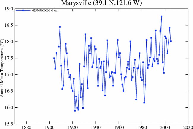 Here is a plot of the temperature history at Marysville as downloaded by Anthony from GISS