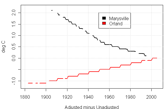 Here are plots of the GISS adjustments for Marysville and Orland. I haven’t tried to wade through GISS adjustments yet. At a first impression, the adjustments look to implemented in 5-year steps. This is obviously something different than Time-of-Observation adjustments or step adjustments. Any thoughts on what they’re doing would be welcome.