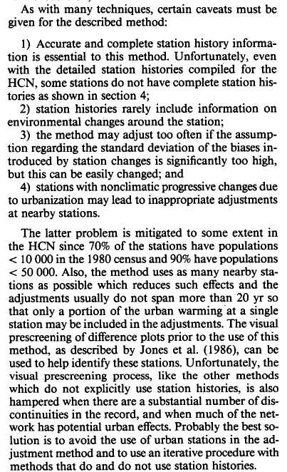 “Stations with nonclimatic progressive changes due to urbanization may lead to inappropriate adjustments at nearby stations… This latter problem is mitigated to some extent in the HCN since 70% of the stations have populations less than 10,000 in the 1980 census and 90% have populations less than 50,000.”
