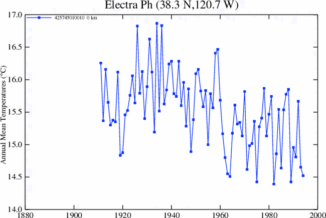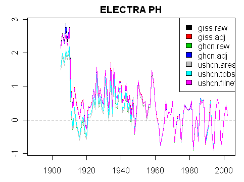 Now here is a plot collating USHCN, GHCN and GISS versions, showing values later than the 1994 GISS termination. It also shows high values in the early part of the 20th century truncated by GISS – doubtless for a “good” reason, but a reason that, to my unknowledge, is unreported.) I checked the monthly data and there are no values in 6 of the 7 series for Electra PH after Dec 1994. However the USHCN adjusted values (Filnet) continue to the most recent USHCN period in this data (Dec 2002). If Electra PH is in the roster of 10 nearest stations for the Reno comparison, it is there despite having no values for the last 13 years.