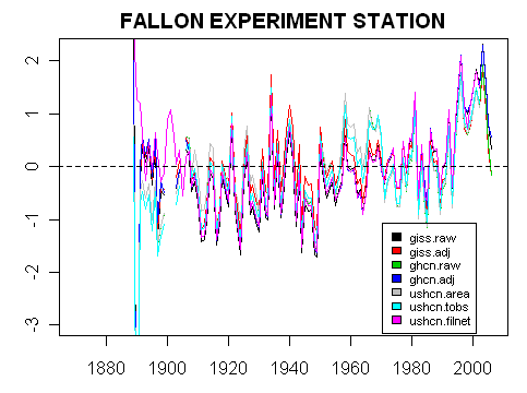 The comparison to other sites indicates to me that the Fallon move has resulted in an upward bias to this series. My suspicion is that the USHCN adjustment methods (which remain opaque to me) are biased against picking up this sort of upward shift, but will pick up downward shifts like dogs on a bone. I think that the reason for this is the inclusion of series with known UHI in the comparanda, which then bias the results. If none of the series are going up (e.g. east Colorado) the net result may not be very problematic, but if there are some bad apples, I suspect that the properties of the method change. Increasingly, it seems to me that USHCN is doing something very Mannian. They throw all kinds of data into a hopper and hope that “advanced” methods can recover something from it, without using a method known to the outside statistical world whose properties were understood and without many people even understanding how the method worked. Subtle biases can creep into this sort of method.