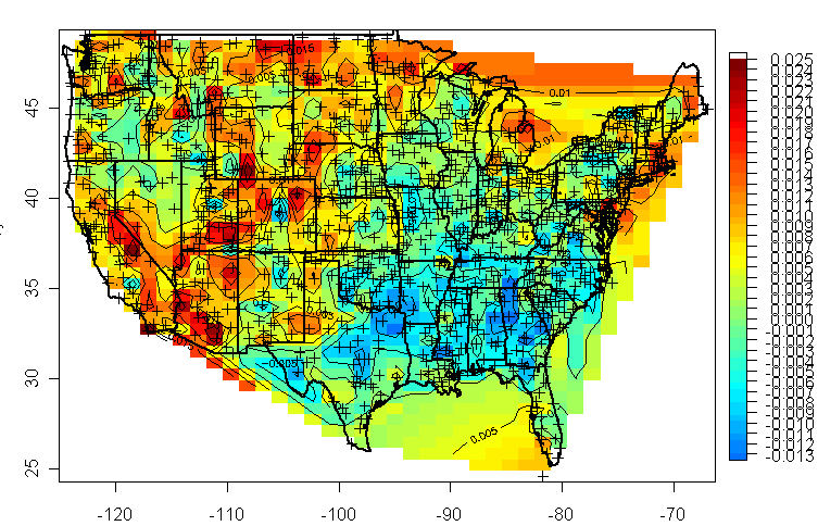 Contour plot programs require that you have gridded data. In order to go from the irregular USHCN locations to gridded data, I used the interp function in the package akima. I looked at a variety of other packages and stumbled across this package. This is my first use of this package. I’m not entirely sure how it works, but the results make sense visually. Some of the other packages over-smoothed for what I wanted. To make a contour plot, I used the image.plot function in the fields package witha couple of twists that are worth paying attention to. I specified the color range tim.colors(64) – tim.colors gives reds and blues in the right places for the comparisons that are done for climate anomalies. Also I specified the breaks so that there were the same number of negative breaks as positive breaks. You need to do this to ensure that blues and reds center in the right place. You have to specify one color less than the number of breaks. (I haven’t figured out how to tidy the color-docing legend yet, but that’s a small point.) You can add geography in fields with the command world(add=TRUE) or US(add-true). I specified a lwd=2. Then I added back the USHCN locations as individual points. Pretty simple. A nice fancy plot in a few lines.