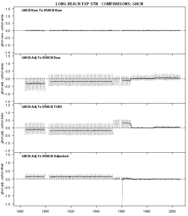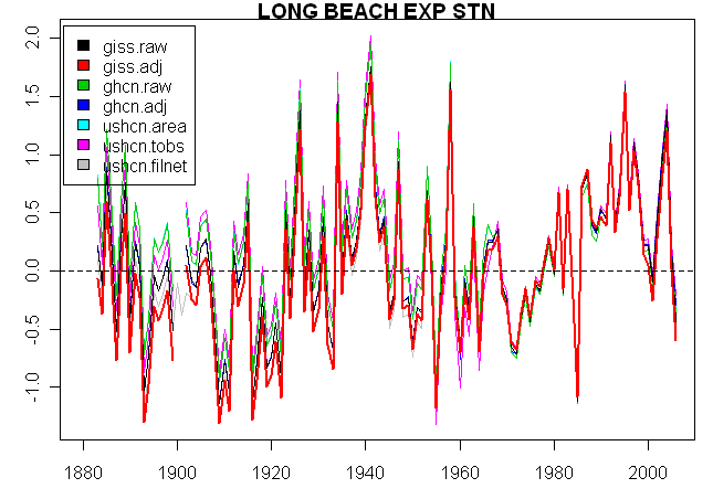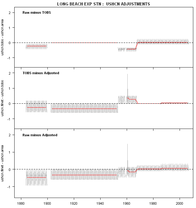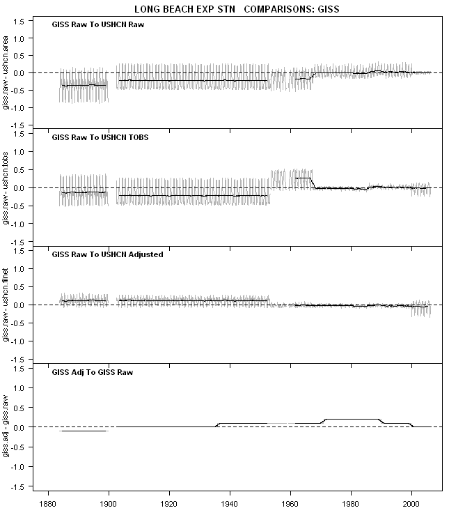 Steve, I hope to post Astoria, OR to SurfaceStations tomorrow. It is an airport based ASOS with records back to the mid 1940’s. It is 16.5 miles SSE of Long Beach, WA site separated by the Columbia River Estuary. Both sites have the same exposure to the prevailing onshore weather patterns which are coming off of the same marine environment. It might be interesting to compare the two. It may give some measurable insight as to the impacts of the more ‘developed’ environment of Astoria. It would also be interesting to see if the two stations were ‘adjusted’ in the same manner.