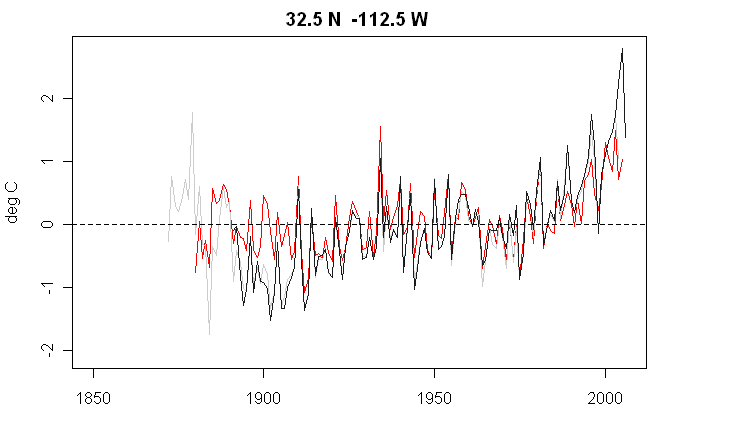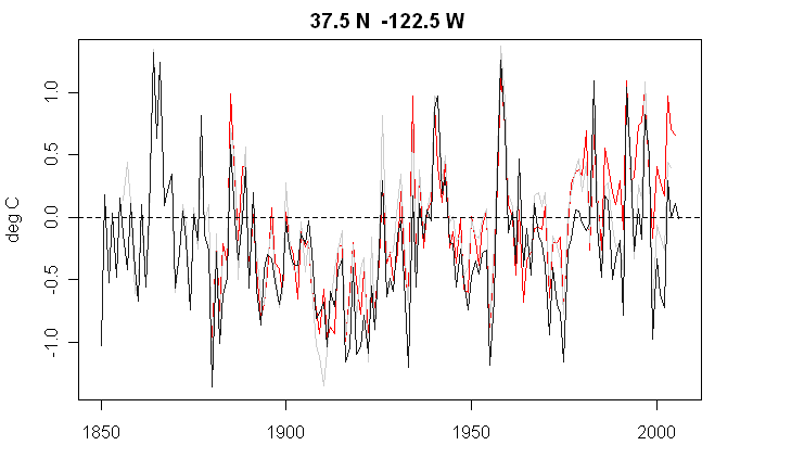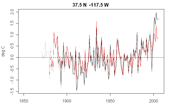 First, here is a plot of gridded data – HadCRU3 (black), HadCRU2(grey and GISS (red) – for the 5×5 gridcell centered at 37.5N 122.5W, which is the CRU gridcell containing Marysville. GISS gridcells are 2×2 gridcells centered at odd longitudes and latitudes – so this will pick up GISS 37N, 123W (and similarly below). One of the most obvious puzzles in this plot is that the two gridded series are in fairly close approximation throughout the remote early parts of the 20th century and then diverge greatly in the last few years – with about a 0.5 deg C discrepancy between GISS and CRU developing after 2000 in what is presumably the best measured few years in world history. (I’ve adjusted GISS from a 1951-1980 base to a 1961-1990 base to match CRU.) Elsewhere, I’ve observed that GISS unaccountably (and without reporting) appears to have switched their input data from USHCN adjusted to USHCN raw in 2000 in a number of stations – their own Y2K problem, as it were. Perhaps this contributes to the discrepancy. However the discrepancy appears to be real.