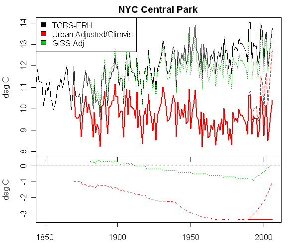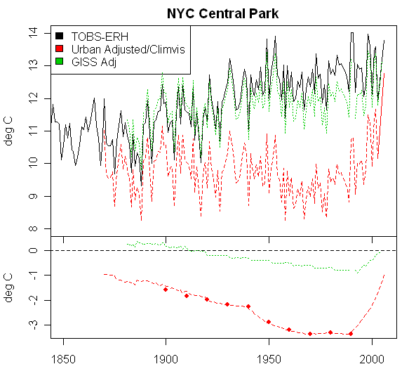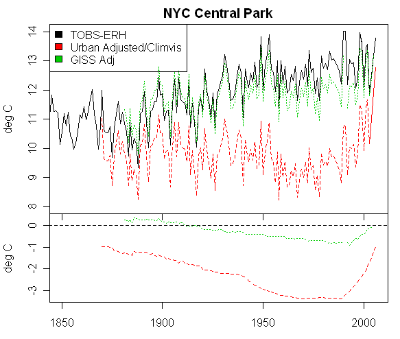 I, too, compared the actual Central Park record with the USHCN reconstruction of the annual mean temperatures for Station #305801 (Central Park) and found just what Steve has illustrated above. I also looked at the USHCN Central Park monthly mean max and min temperatures and sure enough, as the Karl, Diaz et al paper described, most of the urban adjustment was to the minimum temperatures with only slight differences in the max temps. This showed that in order to lower the mid-Century means by 3°C, it was necessary to lower the observed minima by nearly 6°C! To me this makes the USHCN adjustments whether valid or otherwise, an exercise in analysis. It certainly can’t be legitimately characterized as data.