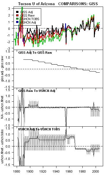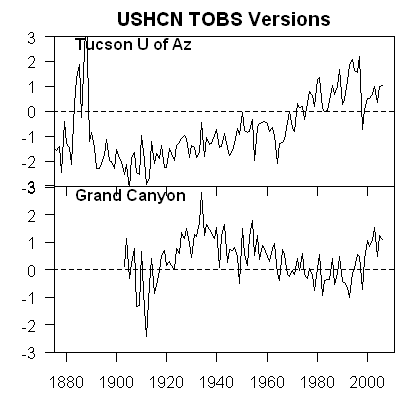 The second panel shows the difference between GISS adjusted and GISS “raw” for each series. The GISS adjustment for Tucson is about 1 deg C over the 20th century and is about 0.5 deg C for Grand Canyon – a “rural” site. What is the operational basis for these adjustments – we could, like Eli, mouth the words from the latest reading, but, at this stage, I am unaware of any information which permits an operational replication of these particular values. Also, and this is an important point, this particular adjustment, which does attenuate the Tucson increase, is NOT used in any other gridcell average (to my knowledge). It is my understanding that CRU uses GHCN/USHCN versions – perhaps the adjusted version, perhaps the TOBS version – no one knows. NOAA says that they use the unadjusted version, but I’m not certain that their readme is correct on this point.