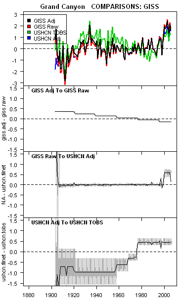 In the GISS adjusted version, the 19th century Tucson upspike has been deleted (not adjusted); this deletion was not done in the USHCN adjustment stage. So even though GISS says that they use USHCN data as is, there is some procedure by which they decided to delete the 19th century upspike. At present, I am unaware of any description of this procedure (but I could have missed it and would welcome any direction to a description). The trend in the Tucson data has been somewhat attenuated, but still remains very strong. The net adjustments in the Grand Canyon series are the more striking: in the USHCN TOBS series, the 1930s are higher than recent values, whereas in the GISS adjusted version, recent values, especially since 2000, are strikingly higher than values in the 1930s. If the trend in GISS data comes from rural stations only and Grand Canyon (and not Tucson) is an unlit station (which I confirmed), how is this possible? I’ll explore the adjustments below.
