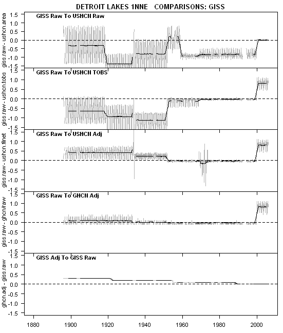 Eli Rabett has recently discussed the Detroit Lakes MN series as an example where the GISS adjusted software has supposedly triumphed over adversity and recovered signal from noise. And yet this same series displays a Hansen adjustment that will should leave anyone “gobsmacked”.