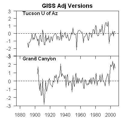 Now some portion of the post-2000 jump in adjusted Grand Canyon values shown here is due to Hansen’s Y2K error, but it only accounts for a 0.5 deg C jump after 2000 and does not explain why Grand Canyon values should have been adjusted so much. In this case, the adjustments are primarily at the USHCN stage. The USHCN station history adjustments appear particularly troublesome to me, not just here but at other sites (e.g. Orland CA). They end up making material changes to sites identified as “good” sites and my impression is that the USHCN adjustment procedures may be adjusting some of the very “best” sites (in terms of appearance and reported history) to better fit histories from sites that are clearly non-compliant with WMO standards (e.g. Marysville, Tucson). There are some real and interesting statistical issues with the USHCN station history adjustment procedure and it is ridiculous that the source code for these adjustments (and the subsequent GISS adjustments – see bottom panel) is not available/