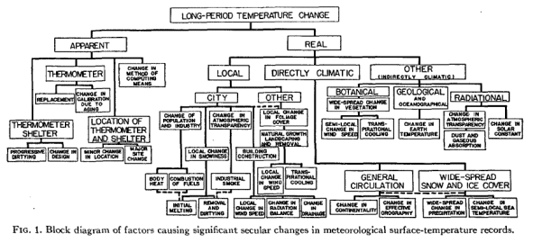 Well before the current debate over the value of the near surface temperature record and its many possible biases, and well before Parker’s UHI studies sought to minimize the effect based on windy -vs- non windy days, J. Murray Mitchell published a paper in 1952 titled: On the Causes of Instrumentally Observed Secular Temperature Trends which was a quality study on the numerous possible effects of localized micro-site effects, as well as broader UHI effects related to population growth in cities. He created a tree chart of the known influences at the time: