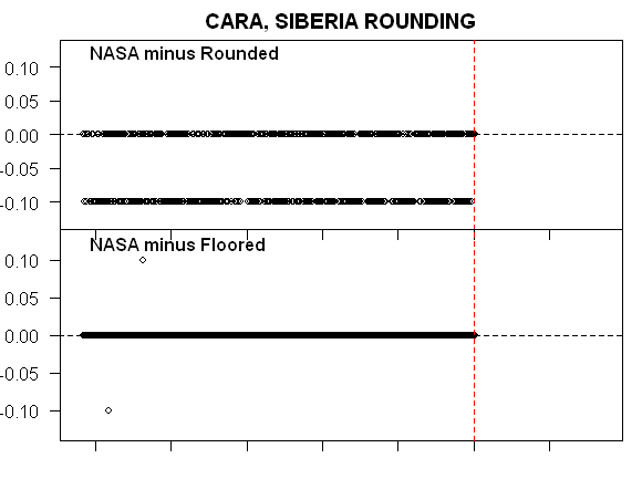 I’ve noticed that even Hansen’s rounding seems to give a little edge to modern values relative to older values. It’s not a big effect, but Hansen doesn’t seem to like to leave any scraps on the table. Cara, Siberia has 3 versions – all of which appear to be the same station; all 3 versions cover more or less the same period (Data here ) and, in this particular case, the values only go to 1990.
