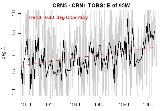 Nonetheless, there appears to be a difference between CRN1,2 and CRN5 stations in this eastern group. In fact, as seen below (and somewhat surprisingly), the difference is greater in the eastern stations than the western stations, an issue that I’ll return to below.